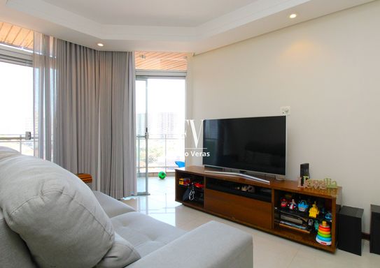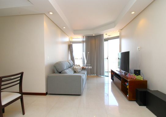 Sala espaçosa para dois ambientes, com porcelanato claro, sanca com iluminação em led, lavabo, integrada com uma bela sacada com vista livre para a cidade e equipada com ar-condicionado para amenizar os dias quentes. Lavabo, banheiro social com gabinete e box em vidro