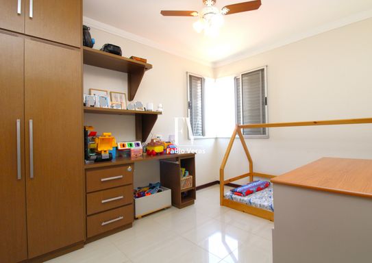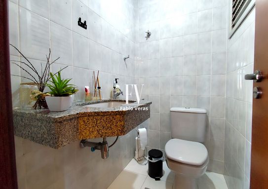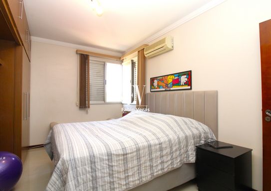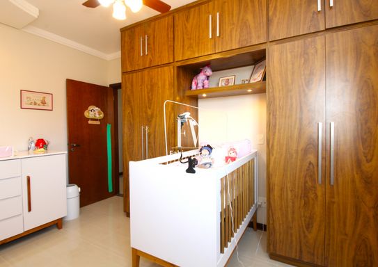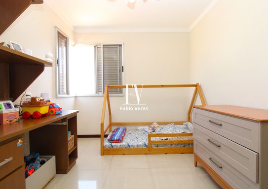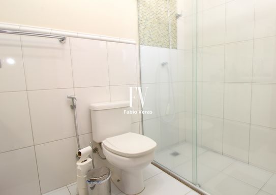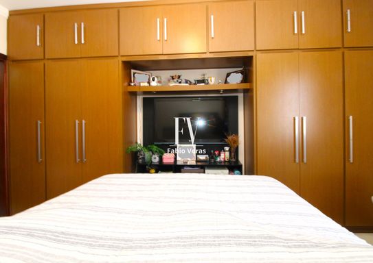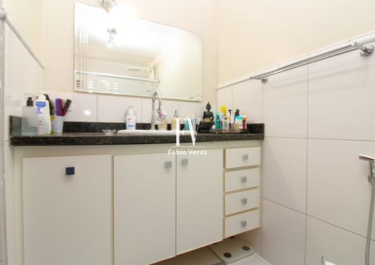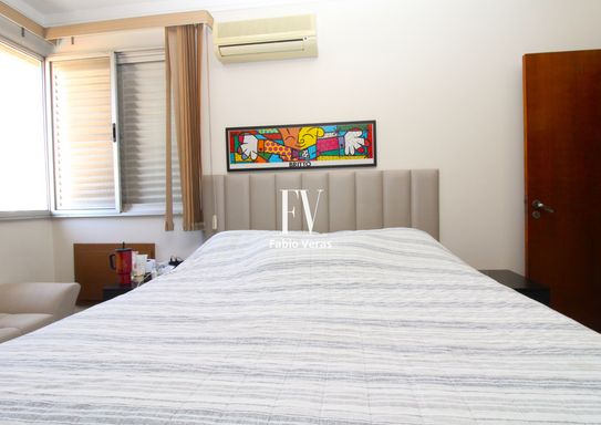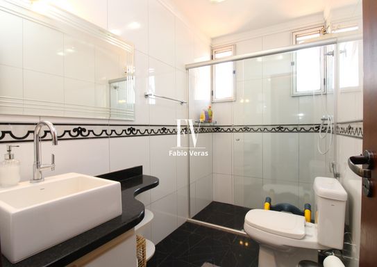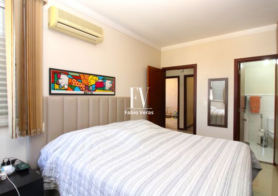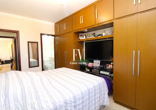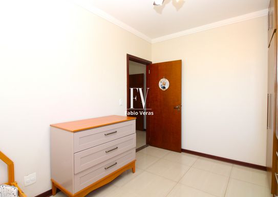 A suíte tem armário planejado, porcelanato claro, vista livre para cidade e ar-condicionado. O banheiro da suíte é grande, conta com gabinete e box em vidro.