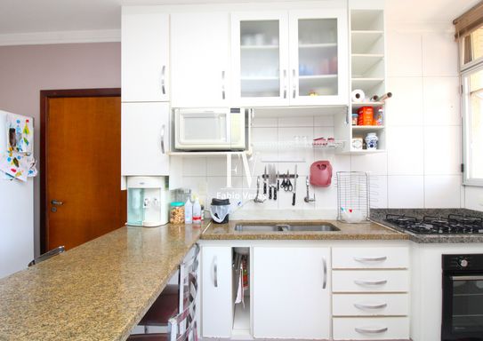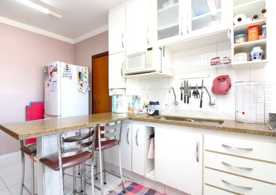 A cozinha é grande, repleta de armários para guardar os itens do dia a dia, pia grande e balcão para refeições rápidas.