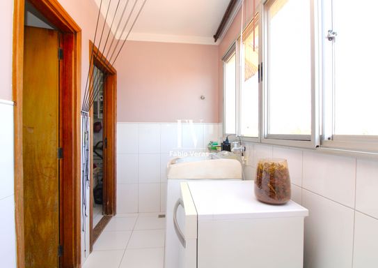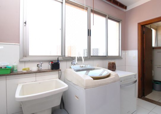 A lavanderia é bem iluminada, ventilada e conta com quarto e banheiro de serviço.